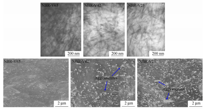 TEM and SEM pictures of FS/NBR vulcanized composites with different NBR Mooney viscosities are shown in Fig. 4. It can be seen from TEM pictures that most FS in all the composites are dissociated and dispersed uniformly as single crystals or crystal bundles with diameters smaller than 100 nm. From SEM pictures, it is observed that a few agglomerates with diameters of 100-500 nm still exist. However, they are much smaller compared with the original size of FS agglomerates. In addition, it can be concluded that NBR with higher Mooney viscosity is conducive to achieve good dispersion of FS, and again it is proven that good dispersion of FS contributes to the formation of strong filler network, which is coherent with former discussion.