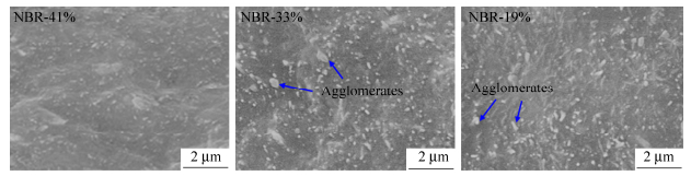Figure 6 shows the SEM photos of cryo-fractured surfaces of the vulcanized composites. The dispersion of FS in NBR with the highest acrylonitrile content is the best. In the composites with low acrylonitrile contents there are a few FS agglomerates with diameters larger than 100 nm. Based on discussion above, take the effects of surface energy of filler and elastomer into consideration, we redress Eqs. (2) and (3) as Eqs. 2(a) and 3(a) respectively. Therefore, we can conclude that as the surface energy difference between filler and elastomer decreases, the force exerted on FS would increase to enhance the filler dispersion. Generally, NBR with high acrylonitrile content has higher surface energy than NBR with low acrylonitrile content, thus the surface energy difference between filler and NBR matrix with high acrylonitrile content is smaller and the filler dispersion is better. As discussed before, good dispersion of FS contributes to the formation of strong filler network. According to Eq. 3(a), the diffusion coefficient of filler increases as the surface energy difference between filler and elastomer decreases. Thus high molecule polarity may help to strengthen the FS re-aggregation. However, as shown in Fig. 5(c) the filler network of NBR/FS composite with 33% acrylonitrile content shows the strongest filler re-aggregation. This can be explained that the high molecule polarity also strengthens the interaction and entanglement of molecule chains, which is averse to FS diffusion. Thus the re-aggregation of fillers shows slightly different pattern with filler dispersion corresponding to acrylonitrile content.