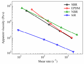 According to the influencing factors discussed above, the difference in filler dispersion and network formation in different elastomer matrices can be explained. Elastomers are usually pseudoplastic fluids (see Fig. 7), their apparent viscosity decreases as the shear rate increases. The surface tension of these elastomers is shown in Table 2. As a result, the difference in viscosity and surface tension of elastomer matrix leads to the difference in filler dispersion and network formation in composites. For FS/SiR composites, agglomerates of FS mainly disaggregate into smaller size through exfoliation during the shear process because of the low viscosity of SiR. In other words, the agglomerates observed in SiR composites stem from partial exfoliation during the blending process rather than re-aggregation during the vulcanization process. Thus, it can be concluded that uniform dispersion of FS would be hard to achieve in most plastics with low processing viscosity.
