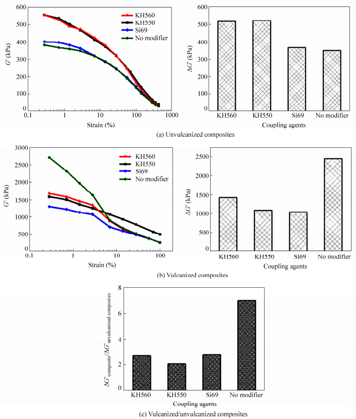 Silane coupling agent is widely used in surface modification of inorganic fillers to enhance the compatibility between filler and elastomer so as to improve the filler dispersion and the filler-elastomer bonding. As discussed above, the dissociation and dispersion of FS in polar matrix like NBR are better than those in nonpolar matrix like SBR and EPDM, especially in SiR matrix. Therefore, nonpolar elastomer SBR was chosen as the matrix to study the effect of the type and the loading of silane coupling agent on the dispersion and network formation of FS in elastomers. As shown in Fig. 8(a), the Payne effects of modified FS/SBR unvulcanized composites with different types of coupling agents are different. The Payne effects of KH550 or KH560 modified FS/SBR unvulcanized composites are the strongest, indicating that the filler networks in these two unvulcanized composites are the strongest. The network of Si69 modified FS is much weaker, and that of unmodified FS is the weakest (although close to that of Si69 modified FS). As discussed before, good dispersion of FS leads to strong filler network, thus the results indicate that the dispersion of KH550 or KH560 modified FS is better than that of Si69 modified FS and unmodified FS in SBR matrix. As shown in Fig. 8(b), the filler network of unmodified FS/SBR composite largely increases after vulcanization and it is stronger than that of modified FS/SBR vulcanized composites. For the modified FS/SBR vulcanized composites, the filler network of KH560 modified FS is the strongest; followed by that of KH550 modified FS and that of Si69 modified FS. As shown in Fig. 8(c), the re-aggregation of unmodified FS during vulcanization is much stronger than that of modified FS.