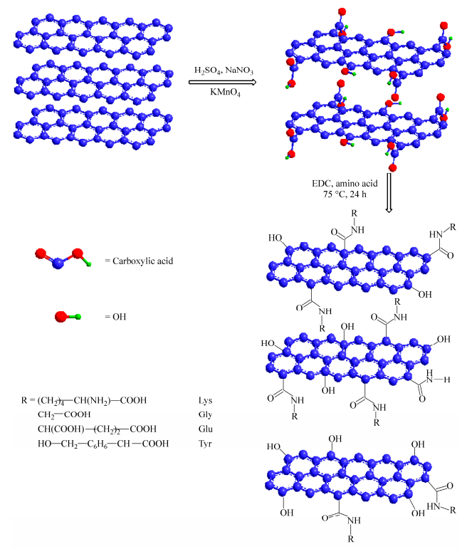 At first, GO was prepared by introducing carboxylic acid, hydroxy and epoxy functional groups between carbon layers of graphite through strong oxidation process (Fig. 1). Based on these functional groups, the resulting GO can be further functionalized with amino acids which are cheap and environmental friendly. As shown in Fig. 1, the condensation reaction occurred between the amine groups of amino acids and carboxylic acid groups on the GO surface.