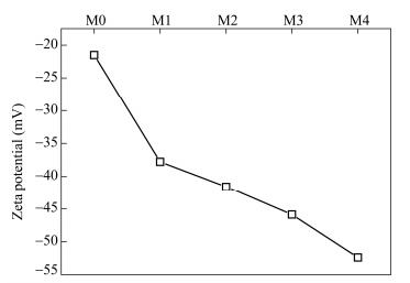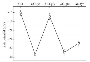 Zeta potential has been used for the characterization of the dispersion of GO-amino acids suspension. It should be noted that zeta potential can be realated to the stability of colloid dispersion, and a high zeta potential will confer stability[36]. As can be seen from the Fig. 6, the zeta potential was about -15.1 mV for GO. And it was -29.1 mV, -16.3 mV, -28.4 mV and -25 mV for GO-lysine, GO-glycine, GO-glutamic acid and GO-tyrosine, respectively. In short, the absolute value of the zeta potential was increased after the GO functionalized with amino acids, which suggested that dispersion stability of the GO-amino acids was improved greatly.