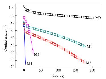 With the extension of time, descent velocity of the contact angle was obviously different for these membranes. In brief, the descent velocity of the contact angle for PVDF/GO-lysine was faster than that of the pristine PVDF membrane. For PVDF/GO-lysine membranes, increasing mass fraction of the GO-lysine made a quick decline of the contact angle descent curve. And the contact angle decreased to 10° within 6 s for M4. As well as for M3, it decreased to 37° within 26 s. All these demonstrated that the hydrophilicity of PVDF membrane was improved greatly with the addition of GO-lysine.