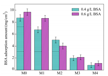 The PVDF/GO-lysine membranes were cut into rectangular shape (2 cm × 1.6 cm) and then washed with PBS solution for 12 h and then were put into tubes filled with 10 mL BSA solutions in PBS solution with concentrations of 0.4 mg/mL and 0.6 mg/mL, respectively. The pH value of the PBS was adjusted to 7.4 in the experiments. At such a pH value, BSA was negatively charged (ζ ~ -22.3 mV). These tubes were incubated into a (25 ± 1) ℃ water bath for 24 h to reach equilibrium. The amount of protein adsorbed on the membrane was calculated by comparing the absorption intensity variation at 280 nm recorded by a UV-Vis spectrometer (HP 8453, USA).