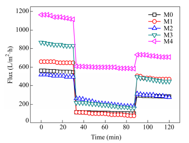 After switching the feed solution to 1.0 g/L BSA solution, BSA filtration was conducted for 1 h and the flux (Jp) was measured at 0.1 MPa. Finally, the membrane was cleaned with deionized water for 30 min and the pure water flux (Jw2) was measured again. The value Jw2/Jw1 represents the relative pure water performance after protein fouling and is used as a measurement of protein fouling for the dynamic flow studies.