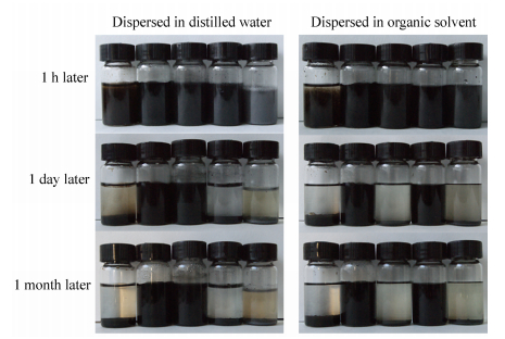 Figure 2 shows the dispersibility digital photographs of GO and GO-amino acids in water and organic solution, respectively. The dispersion of GO and GO-amino acids was both homogeneous at beginning in both water and organic solvent. After one day, the GO had a tendency to aggregate and was deposited at the bottom. Compared to GO, there was no obvious subsidence of GO-amino acids, especially of the GO-lysine. One month later, homogeneous and stable dispersion was observed for GO-lysine in both water and organic solvent. And GO and other GO-amino acids showed subsidence to some extent. In a word, GO-lysine kept a good dispersion stability even after a long time in both water and NMP, which made it a better choice as an additive to modificate the virgin PVDF membrane.