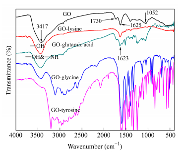 FTIR measurement was employed to investigate the chemical composition of the GO-amino acids. In the GO spectrum (Fig. 3), there were three characteristic peaks. The peak at 1052 cm-1 was attributed to the C―O bond. The peak at 3417 cm-1 was attributed to the O―H stretching bands of hydroxy and carboxylic acid moieties. And the presence C=O peak at 1730 cm-1 was attributed to C=O stretching band of carboxylic acids. These three peaks confirmed the presence of oxygen containing functional groups on GO surface after the oxidation process. For the spectra of different GO-amino acids, the C=O stretching of amide and carboxylate groups at the range of 1620-1630 cm-1 and the O―H and N―H stretching peaks at 3420 cm-1 confirmed the covalent functionalization of the GO by amino acids molecules successfully.