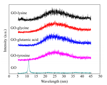 Figure 4 shows the XRD patterns of GO and variety of GO-amino acids. Obviously, the XRD pattern of GO showed a strong and sharp peak at 10.8°, which was different with the noticeable peak of graphite at 26.6°[34]. For the XRD patterns of GO-amino acids, the diffraction peak was obviously shifted to a higher diffraction angle compared to GO, indicating a decrease in the interplanar spacing determined from Bragg's law (2dsinθ = nλ). Specifically, the diffraction peak for GO-amino acids (Lysine, glycine, glutamic acid and tyrosine) shifted back to the original peak at 25°. The XRD pattern revealed that GO-amino acids demonstrated a particular crystal structure between that of graphite and graphene oxide.