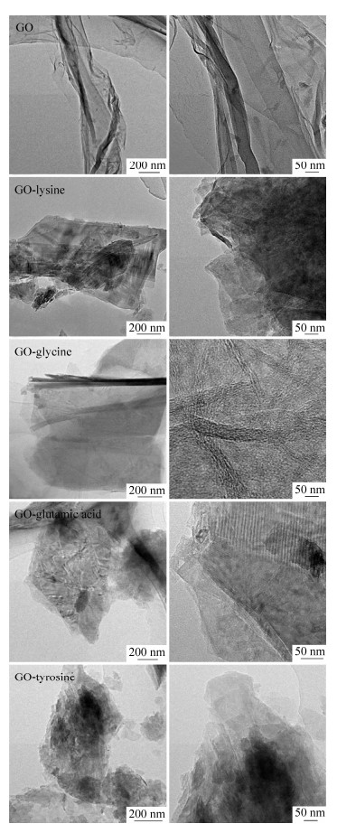 TEM measurement was performed to observe the morphological structure of GO and GO-amino acids, which is shown in Fig. 5. We can distinctly find that GO exhibits a natural tendency to unfold and presents a flake-like and wrinkled morphology resembling the exfoliated crumpled thin flake. And the GO-amino acids possessed clear crystal structure compared to GO, which was corresponding with the XRD results. The crystal structure was more obvious for GO-lysine and GO-tyrosine and the lattice fringe was clear under high magnification TEM. Based on the TEM results above, we can conclude that the GO-amino acids exhabited crystal structure obviously compared to GO.