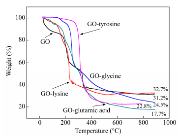 In this study, TGA analysis was used to determine the thermal stability of GO and GO-amino acids, and the results are shown in Fig. 7. For GO curve, a slight weight loss around 100 ℃ was attributed to the removal of adsorbed H2O molecules by O-containing functional groups tightly bounded into GO stacked structure. In addition, the weight loss around 250 ℃ was attributed to the decomposition of epoxy groups (C―O―C) on the GO surface, yielding CO, CO2, and steam[37-40]. And the loss around 400 ℃ to 500 ℃ may be attributed to the loss of carboxyl (C=O) and carboxylic groups (O―C=O)[41, 42]. For GO-amino acids, the total weight loss was 67.3% (GO-lysine), 75.5% (GO-glycine), 82.3% (GO-glutamic acid) and 77.2% (GO-tyrosine) respectively, which was related to the pyrolysis of organic moieties on the graphene oxide sheets. Although the grafting rate of lysine modified GO was relatively low, the thermal stability was better than others obviously.
