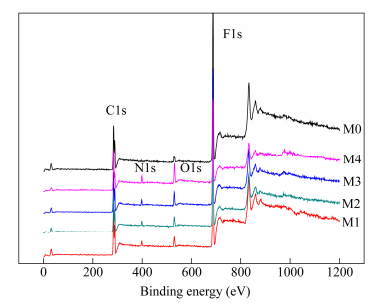 The element of the hybrid membranes was analysed by XPS in detail. Figure 8 showed the wide survey XPS spectra of virgin PVDF membrane (M0) and PVDF/GO-lysine membranes. Only C and F elements and trace amount of O element were observed in the survey spectrum of virgin PVDF membrane, corresponding to C1s (binding energy, 284.39 eV) and F1s (binding energy, 686.31 eV) for PVDF, O1s (530.27 eV) for PVP, respectively. In contrast with virgin PVDF membrane, there was a new peak of N1s at 398.25 eV for the PVDF/GO-lysine membranes. And the peak intensity of O1s and N1s was enhanced with the increase of the GO-lysine mass fraction from M1 to M4 gradually. This confirmed that more hydrophilic amino and carboxyl groups migrated to the membrane surface with the increase of GO-lysine mass fraction during the process of membrane preparation. And the migration made the peak intensity of N1s and O1s on membranes surface increased, which was conducive to improve the membrane surface performance.