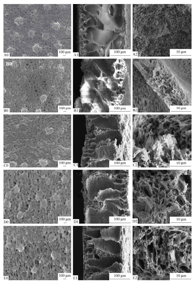 For the increased pore size and porosity, the presence of the amphiphilic component in the casting solution may be expected to increase the affinity of casting solution and precipitant, enhancing solvent-nonsolvent exchange and creating the conditions for instantaneous de-mixing and associated macrovoid formation. Large macrovoids in the substructure typically result in the increased permeability, which are unsuitable for highpressure applications[43].