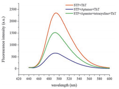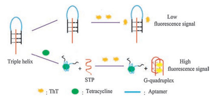 In this assay, a label-free fluorescent sensing platform based on triple-helix molecular switch (THMS) and G-quadruplex was developed for the detection of tetracycline. We demonstrated this approach by using THMS, which consists of a central section with a shortened 8-mer aptamer sequence with high affinity to tetracycline and flanked by two arm segments. G-rich oligonucleotide can specifically bind to thioflavin T (ThT) as a signal transduction probe (STP). In the absence of tetracycline, THMS remains stable, the fluorescence of background is low. By the addition of target tetracycline, the aptamer-target binding results in the formation of a structured aptamer-target complex, which disassembles the THMS and releases the STP. The free STP self-assembles into G-quadruplex and specifically binds to ThT which generates a obvious fluorescence enhancement. Using the triple-helix molecular switch, the developed aptamer-based fluorescent sensing platform showed a linear relationship with the concentration of tetracycline ranging from 0.2 to 20.0 nmol/L. The detection limit of tetracycline was determined to be 970.0 pmol/L. The assay avoids complicated modifications or chemical labeling, making it simple and cost-effective. So, it is expected that this aptamer-based fluorescent assay could be extensively applied in the field of food safety inspection.