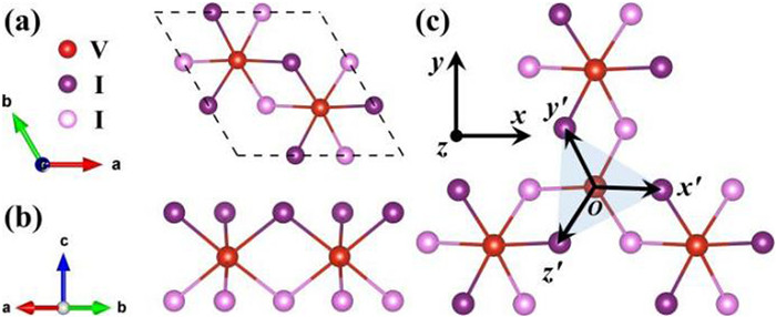 Figure 1.  View of the Ⅵ3 monolayer. (a) The c axis (V in red; upper layer Ⅰ in violet; lower layer Ⅰ in light purple). (b) The a axis. (c) Two coordinate systems of the Ⅵ3, local {xyz′} basis and global {xyz} basis.