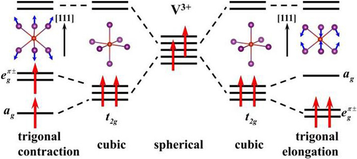 Figure 2  Left: trigonal contraction; right: trigonal elongation. The t2g splits into the ag and the egπ with opposite energy level order under the trigonal contraction and the elongation.