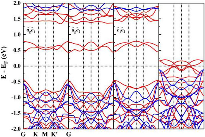 Figure 3  Calculated non-SOC electronic spin resolved band structures the monolayer Ⅵ3 in the ferromagnetic state along the high-symmetry paths of corresponding Brillouin zones. Occupied states from left to right are: a˜ge˜1, a˜ge˜2, e˜1e˜2 and unconstrained occupation. Red: spin up; blue: spin down.