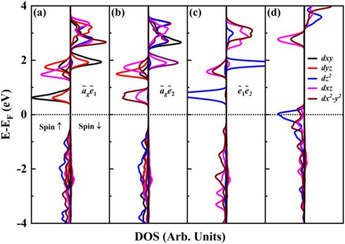 The spin-resolved projected density of states (PDOS) of the 4 different occupied states are plotted in Fig. 4. We note that the fully occupied spin-up lower Hubbard band is mainly located around -2 eV below the Fermi level, and the spin-down empty upper Hubbard band is located around 2 eV above the Fermi level in Fig. 4. It is estimated that the Hubbard U is about 4 eV, very close to the 3.68 eV we set in the DFT + U approach. The contribution of the VBM of the a˜ge˜1 and a˜ge˜2 states is mainly from the dz2 orbital of V; while the VBM of the e˜1e˜2 state is the contribution of the dx2y2 orbital. For the e˜1e˜2 occupancy, dxy and dx2y2 are doubly degenerate; d and d are doubly degenerate. Note that the wave functions are linear combination of the d orbitals, and the diagonal elements of the density matrix are the sum of the squares of the expansion coefficients of a certain d orbital in all occupied state wave functions. For example, for the a˜ge˜1 occupied state, ideal contributions of dz2, dx2y2 and d orbitals are 1, 23 and 13 respectively; the corresponding self-consistent results are 0.87, 0.78 and 0.47, respectively. Since the Ⅴ-Ⅰ bond has both ionic and covalent contributions, a small amount of d and d orbitals also participate in the a˜ge˜1 state [35], and the corresponding matrix elements in the a˜ge˜1 state are 0.18 and 0.27. For the other two occupied states (a˜ge˜2 and e˜1e˜2), the calculated results are also in line with expectations. That is to say, the initial guessed occupied states are very close to the self-consistent results, indicating that the calculation results are reliable.