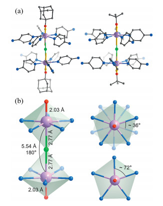 Figure 6  (a) The structure of dimeric Dy(Ⅲ) model complex. All hydrogen atoms are omitted; (b) the evolution of coupling constants (orange and red squares for Jexch and Jdip, respectively) for the model molecules with the decrease of intramolecular Dy(Ⅲ)-Dy(Ⅲ) distance.