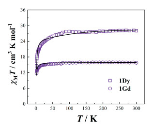 Figure 2.  Temperature dependence of the χMT product for 1Dy (purple square) and 1Gd (purple circle) under a 1000 Oe dc field. The solid black lines represent the best fits based on Eq. 1 through PHI program for Gd2, and according to Lines model by POLY_ANISO program for Dy2. Note: The black solid line for 1Dy is the result of fitting data multiplied by a coefficient of 1.02.