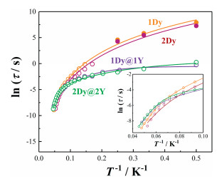 Figure 3.  Plots of temperature-dependent magnetic relaxation times of 1Dy (orange circles), 2Dy (plum circles), 1Dy@1Y (purple circles) and 2Dy@2Y (green circles) under zero dc magnetic field. The hollow and solid points represent the data obtained from ac susceptibility and dc magnetization decay measurements, respectively. The solid lines are the best fits using Eqs. 2 and 3. Insert: The expanded region of lnτ-T-1 plots above 10 K.