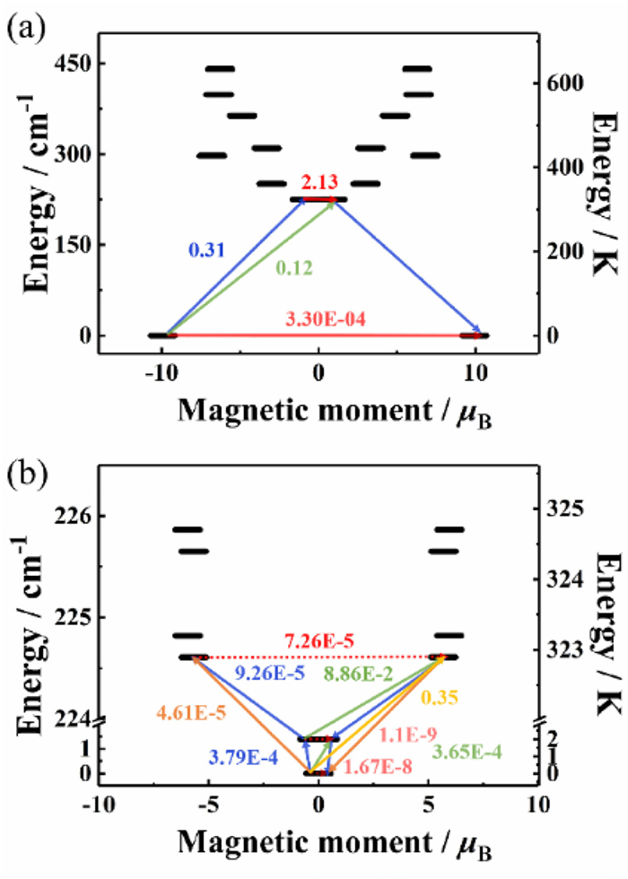 Figure 5.  Ab initio calculated possible magnetic relaxation path diagrams for (a) 1Dy’s fragment 1 and (b) 1Dy. The horizontal red arrows represent the QTM/TA-QTM processes, while the non-horizontal ones show the spin-phonon transition paths. The numbers next to the solid arrows are the averaged transition magnetic moments ((|μX|+|μY|+|μZ|)/3) in μB between the connecting pairs, while the tunneling splittings ∆tun in cm-1 close to the red dotted arrows.