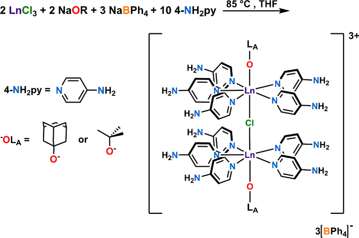 All compounds were successfully isolated by the similar synthesis routes shown in Scheme 1. The alkoxides of 1-AdO- and tBuO- (-OR) were prepared by mixing corresponding alcohols and NaH in THF solvent. Then the reaction of LnCl3, NaOR, NaBPh4 and 4-aminopyridine (4-NH2py) in THF afforded the complexes, {[LnLA(4-NH2py)5]2(µ-Cl)}[BPh4]3 (For LA- = 1-AdO-, 1Ln; for LA- = tBuO-, 2Ln; Ln = Dy, Gd). To remove the intramolecular magnetic couplings, the yttrium-diluted samples of 1Dy@1Y and 2Dy@2Y were also synthesized by utilizing a 9:1 mixture of YCl3: DyCl3.
