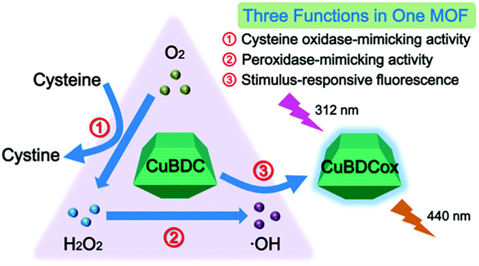Figure 2 Schematic diagram of the simulated reaction of the cascade cysteine oxidase of peroxidase and cudc and its luminescence release. Reproduced with permission [226]. Copyright 2018, The Royal Society of Chemistry.