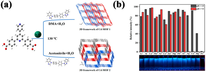 Figure 3 (a) Synthesis route and 3D framework of Cd-MOF. (b) Luminescent relative intensity of Cd-MOF for various metal ions in pH 1.00 and 7.02 and photographs of a suspension of Cd-MOF in the presence of various metal ions under 254 nm UV light. Reproduced with permission [234]. Copyright 2021, American Chemical Society.