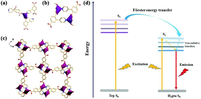 Figure 4 (a) The coordination environment of Zn2+ ions in ZJU-108. (b) A rectangular node formed by two adjacent equivalent Zn atoms. (c) Schematic diagram of the ZJU-108 skeleton structure along the C-axis, where red represents zinc ions, cyan represents nitrogen atoms, and blue represents oxygen atoms. (d) The energy transfer mechanism between Trp and H2pta leads to the change of ligand emission. Reproduced with permission [237]. Copyright 2018, The Royal Society of Chemistry.