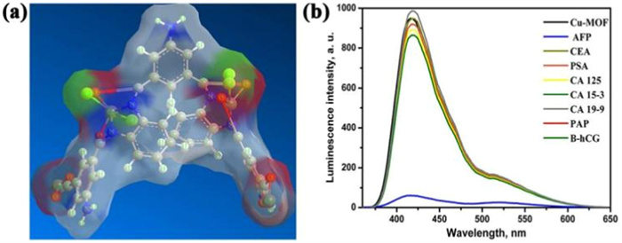 Figure 5 (a) Three-dimensional structure characterization of Cu-MOF-NPs. (b) PL spectra show the effects of Cu-MOF-NPs as biomarkers in different types of cancer. Reproduced with permission [240]. Copyright 2019, Wiley-VCH.