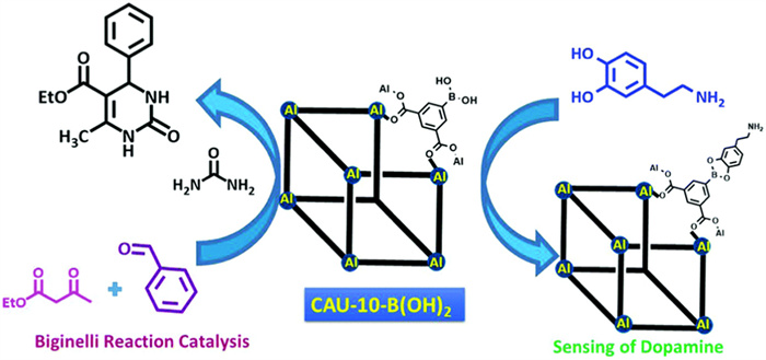 Figure 6 Water-stable boric acid functionalized aluminum(Ⅲ) MOF that not only senses dopamine but also catalyzes the Biginelli reaction. Reproduced with permission [254]. Copyright 2017, The Royal Society of Chemistry.