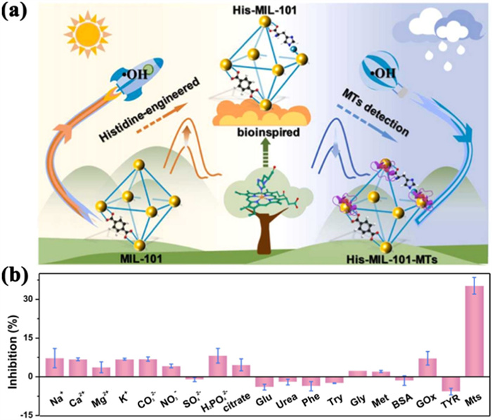 Figure 7 (a) Schematic diagram of mt detection using a His-MIL-101-based biosensor. (b) Selective detection of His-MIL-101(Fe) based suspension in water in the presence of other interfering substances. Reproduced with permission [245]. Copyright 2022, The Royal Society of Chemistry.