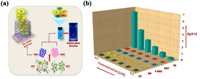 Figure 8 (a) The NMMOF sensor detects the working principle of PA. (b) Stren-Volmer diagram of various nitro compounds in suspension of MOF in water. Reproduced with permission [250]. Copyright 2022, Elsevier B.V.