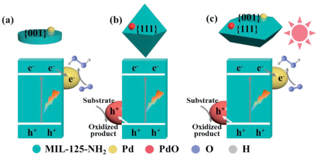 • The facet effect of metal-organic frameworks (MOF) on regulating the property of loaded co-catalysts is an important but unexplored issue in the field of photocatalysis. In this work, a series of MIL-125-NH2 polyhedrons (MIL = Materials Institute Lavoisier) with facet exposure of {001}, {001}/{111} and {111} are synthesized and used to load Pd-based co-catalysts for photocatalytic oxygen reduction reaction (ORR) toward H2O2 production. The different facets with distinct chemical environments (Ti-O clusters on {111} facets and carboxyl ligands on {001} facets) result in the selective loading of Pd0 and PdO dominated cocatalysts on {001} and {111} facets, respectively. The {001}/{111} co-exposed MIL-125-NH2 thus enables the spatially separated loading of Pd0 and PdO dual cocatalysts respectively. Pd0 efficiently traps the photoexcited electrons and PdO trends to capture the holes, collaboratively promoting the directional separation of photogenerated electron-hole pairs. As a result, the photocatalytic ORR activity is significantly enhanced with a H2O2 production rate of 128.6 mmol L-1 g-1 h-1, superior than pristine and single cocatalyst modified MIL-125-NH2 samples. Our findings provide new insight into the design of high-performance photocatalysts.