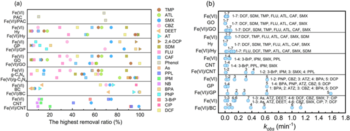 Figure 1.  (a) The highest efficacy of carbon materials (CMs), ferrate [Fe(Ⅵ)], and Fe(Ⅵ)/CMs systems for relevant pollutants degradation. (b) Determined reaction rate constants of relevant pollutants in CMs, Fe(Ⅵ), and Fe(Ⅵ)/CMs systems. Data were derived from Table S2 (Supporting information).