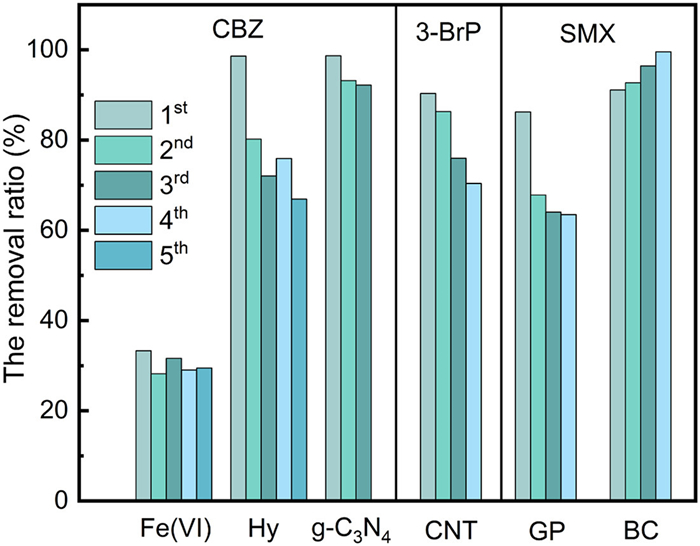 After the reaction with Fe(Ⅵ), the CMs utilized in the process were consistently collected for potential reutilization in Fe(Ⅵ) oxidation. It is noteworthy that discarded BC exhibits a more pronounced impact on expediting contaminant oxidation compared to raw BC. The incorporation of used BC into the Fe(Ⅵ)/BC system significantly enhances the rate at which micro-pollutants were removed [59]. The duration of complete oxidation decreased progressively with each successive recycling of the BC, reaching 10 min in the third cycle and only 5 min in the fourth [56].