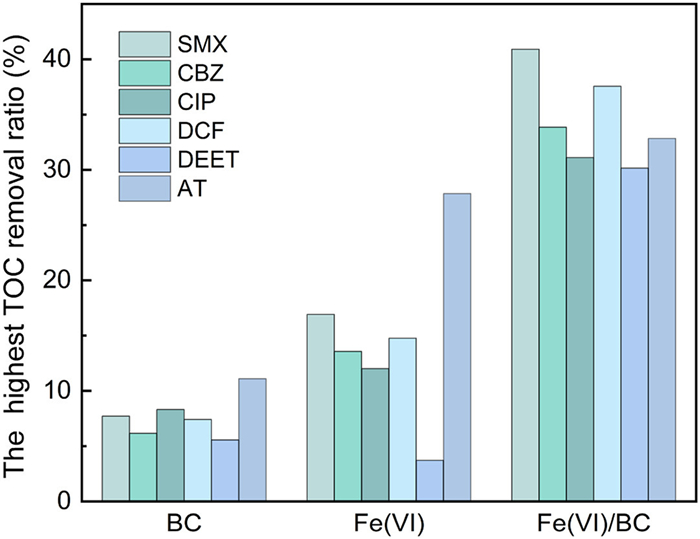 Figure 2.  The highest total organic carbon (TOC) removal ratios of relevant pollutants by biochar (BC), Fe(Ⅵ), and Fe(Ⅵ)/BC systems. Data were derived from Table S2.