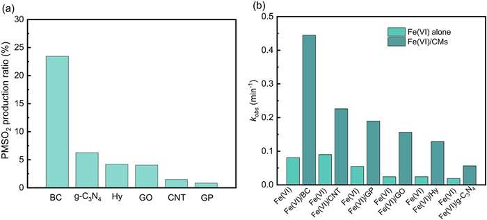 Figure 4.  (a) The production rate of methyl phenyl sulfone (PMSO2) was investigated in different ferrate [Fe(Ⅵ)]/carbon materials (CMs) systems, with each quality of CMs being examined. (b) A comparison between the determined reaction rate constants for the production of PMSO2 in the Fe(Ⅵ) system and the Fe(Ⅵ)/CMs systems. Data were derived from Table S4 (Supporting information).