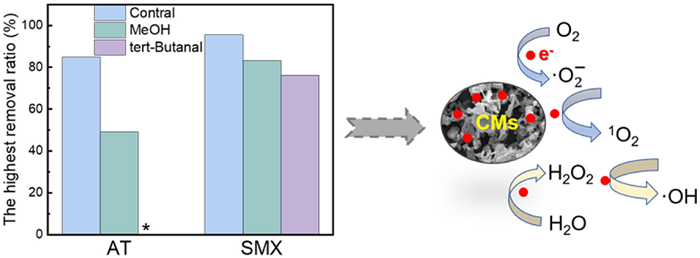 Figure 5  Oxidation of AT and SMX by ferrate/biochar with methanol (MeOH) or tert–butanol. Plausible radical species in ferrate/carbon materials systems. Data were derived from Table S5 (Supporting information).