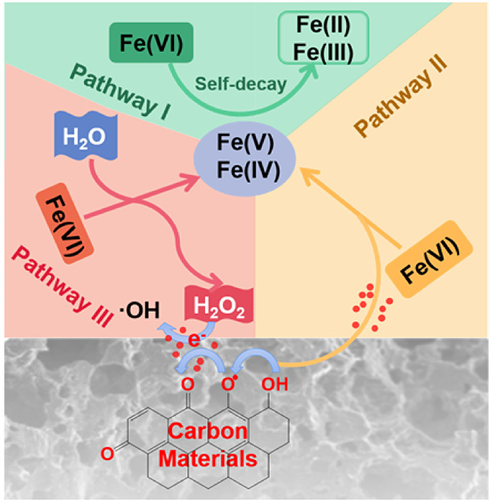 Due to the sluggish rate of Fe(Ⅳ)/Fe(Ⅴ) production from Fe(Ⅵ) alone, enhancing the activation of Fe(Ⅵ) is pivotal for improving the oxidation capacity in the Fe(Ⅵ) system. Consequently, numerous strategies have been proposed by researchers to activate Fe(Ⅵ), thereby promoting the generation of Fe(Ⅳ)/Fe(Ⅴ) [32]. Different approaches can be employed to enhance the generation of Fe(Ⅳ)/Fe(Ⅴ) from Fe(Ⅵ), such as acidic substances (e.g., hydrochloric acid), metal ions (e.g., Fe(Ⅲ)), carbon materials (CMs), reducing agents [32-35].