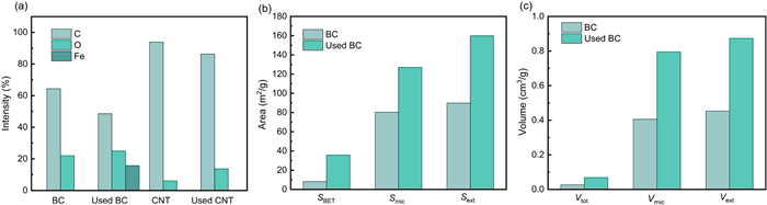 Figure 7  (a) The determination of atomic concentration and chemical state in both initial carbon materials as well as exhausted carbon materials. (b) The comparison of surface area between the original biochar (BC) and the utilized BC. (c) The changes in pore volume between the initial BC and the used BC. Data were derived from Table S6 (Supporting information).