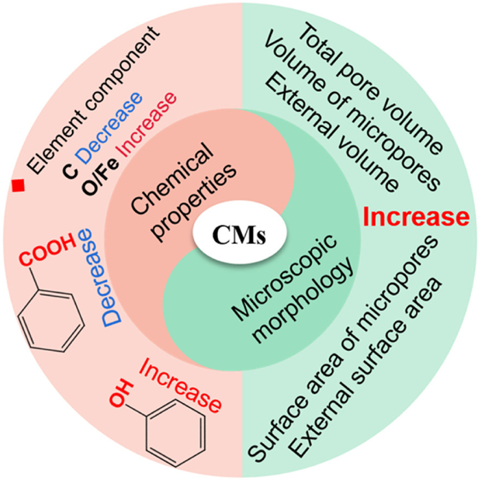The reaction of CMs with Fe(Ⅵ) resulted in a significant increase in specific surface area and void volume, accompanied by a decrease in hydroxyl groups and an increase in carboxyl groups on the surface, as well as enhanced graphitization. The final product of the decomposition of Fe(Ⅵ) (Fe(Ⅲ) floc) will be adsorbed onto the surface of the CMs. The observed changes suggest that the activation of Fe(Ⅵ) leads to an increase in the number of adsorption sites on the surface of CMs, thereby enhancing the efficiency of pollutant adsorption. Among the seven CMs summarized, Fe(Ⅵ)/BC system show more obvious advantages, and the research on BC should be strengthened in the future research.