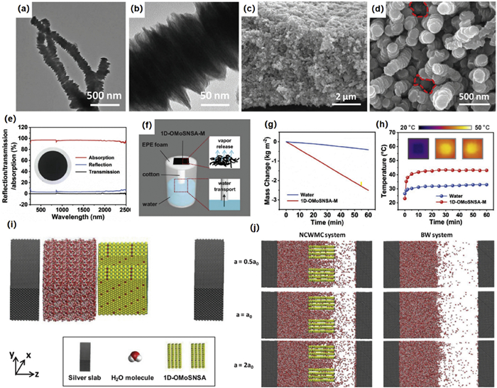 Figure 2 (a, b) TEM images of 1D-OMoSNSA at different magnifications. (c, d) SEM images of 1D-OMoSNSA-M at different magnifications. (e) UV–vis-NIR spectra of the 1D-OMoSNSA-M. (f) Device model diagram and working principle. The evaporation rate (g) and the surface temperature change (h) of the 1D-OMoSNSA-M at 1 sun, compared with pure water. (i) Microstructure of NCWMC. (j) Water molecule evaporation model in the NCWMC and BW system. Reprinted with permission [34]. Copyright 2020, Wiley-VCH GmbH.