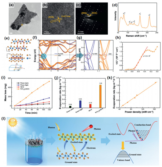Figure 3 (a) TEM image of WTe2 nanosheets. HRTEM image (b) and SAED pattern (c) of the region outlined in orange in (a). (d) Raman spectrum of WTe2 nanosheets. (e) The crystal structure of 2D Td-WTe2. (f) Band structure of 2D Td-WTe2 with and without SOC. (g) High-resolution band structure of 2D Td-WTe2 (h) Mott-Schottky curve of 2D WTe2. (i) Mass change of water for different photothermal converters. (j) The corresponding evaporation rate of different photothermal converters. (k) Evaporation rate of WTe2@MCE under different light power. (l) Schematic diagram solar photo-hot water evaporation of WTe2@MCE and photo heat conversion schematic diagram. Reprinted with permission [47]. Copyright 2023, Tsinghua University Press.