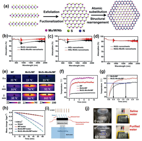 Figure 4 (a) Synthesis Process of TMD-NR-TMNs Heterostructure. Absorbance spectra of (b) MoS2-Mo5N6, (c) WS2-W2N3, and (d) NbS2-Nb4N5 in the wavelength range of 200–2500 nm. (e, f) Surface temperature images and temperature curves for MF, MoS2/MF and MoS2-Mo5N6/MF under 1 kW/m2 solar irradiation. (g) Light-induced temperature change in MoS2/MF and MoS2-Mo5N6/MF. (h) Water mass change under 1 kW/m2 solar irradiation as a function of irradiation time. (i) The schematic image of heat flows in the photothermal evaporation system. (j) Evaluate the purity of water using a multimeter with a constant distance between electrodes. Reprinted with permission. Reprinted with permission [57]. Copyright 2022, Elsevier Ltd.