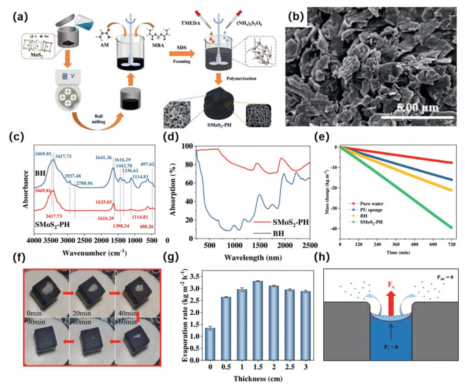 Figure 5 (a) Preparation process of SMoS2-PH. (b) SEM images of the SMoS2-PH. (c) FTIR spectra of blank hydrogel (BH) and SMoS2-PH. (d) Absorption ratio of UV/vis-NIR spectra of SMoS2-PH and BH. (e) Evaporation rate of pure water under 1-sun irradiation. (f) Salt dissolution process on SMoS2-PH surface. (g) The effects of SMoS2-PH thickness on evaporation rate of pure water under 1-sun illumination. (h) Model of water evaporation. Reprinted with permission [30]. Copyright 2022, Wiley-VCH GmbH.