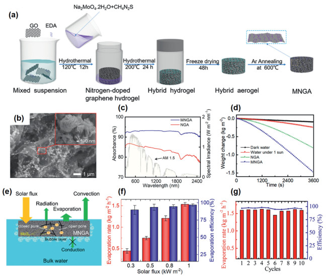 Figure 6. (a) Process diagram for preparing N doped graphene aerogels (MNGA). (b) SEM images of MNGA. (c) UV–vis-NIR absorption of MNGA and NGA. (d) Weight change of different samples under 1 sun illumination. (e) Structure diagram of MNGA evaporator. (f) Evaporation rate and efficiency of MNGA under low solar flux. (g) Durability test of MNGA. Reprinted with permission [79]. Copyright 2022, American Chemical Society.3.2 Sponges decorated by TMDs