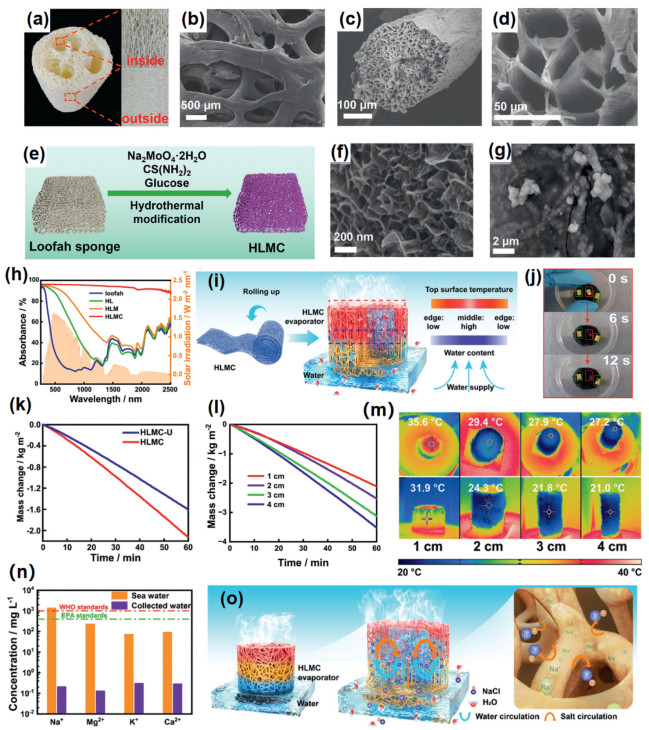 Figure 7 (a) morphological and structural diagram of loofah sponge. SEM images of (b) low resolution, (c) high resolution, and (d) microchannels in fibers. (e) Preparation flowchart of the 3D hydrothermally decorated loofah sponge with MoS2 sheets and carbon particles HLMC. SEM images of the surfaces of (f) HLM and (g) HLMC. (h) The light absorption rates of loofah, HL, HLM, and HLMC in the UV–vis-NIR spectra. (i) Preparation and spatial morphology, temperature distribution of 3D HLMC evaporator. (j) Differences in water transport rates at different spatial locations. (k) Evaporation rates of HLMC-U and HLMC under 1 sun irradiation. (l) Differences in water evaporation rates at different heights of exposure. (m) Infrared images of the top surface and sidewalls of HLMC samples exposed to different heights under one solar irradiation. (n) Change of salt ion concentration in water before and after evaporation. (o) Schematic diagram of steam generation and ion exchange in HLMC. Reprinted with permission [83]. Copyright 2023, American Chemical Society.