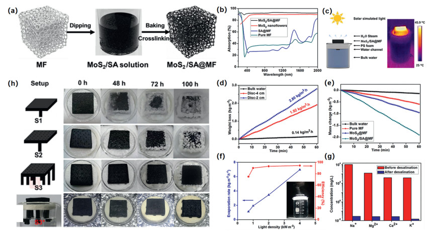 Figure 8 (a) Schematic diagram of preparing MoS2/SA@MF hybrid sponge. (b) UV–vis-NIR absorption spectra of pure melamine-formaldehyde (MF), SA@MF, MoS2 nanoflowers and MoS2/SA@MF hybrid sponge. (c) Schematic diagram of evaporator composition and infrared image of evaporator at MoS2/SA@MF. (d) Evaporation rate curves for MoS2/SA@MF evaporators of different sizes. (e) STG evaporator with different compositions under 1 kW/m2. (f) Performance comparison in evaporation rates and solar-thermal conversion efficiencies under different optical intensity. (g) The concentration changes of various ions before and after solar evaporation and desalination. (h) Photo of evaporator change over time. Reprinted with permission [99]. Copyright 2021, Elsevier Ltd.