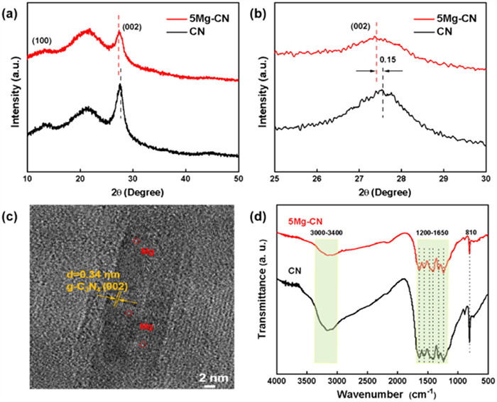 Figure 1.  (a) XRD patterns and (b) enlarged view of CN and 5Mg-CN. (c) HRTEM image of 5Mg-CN. (d) FTIR spectra of CN and 5Mg-CN.